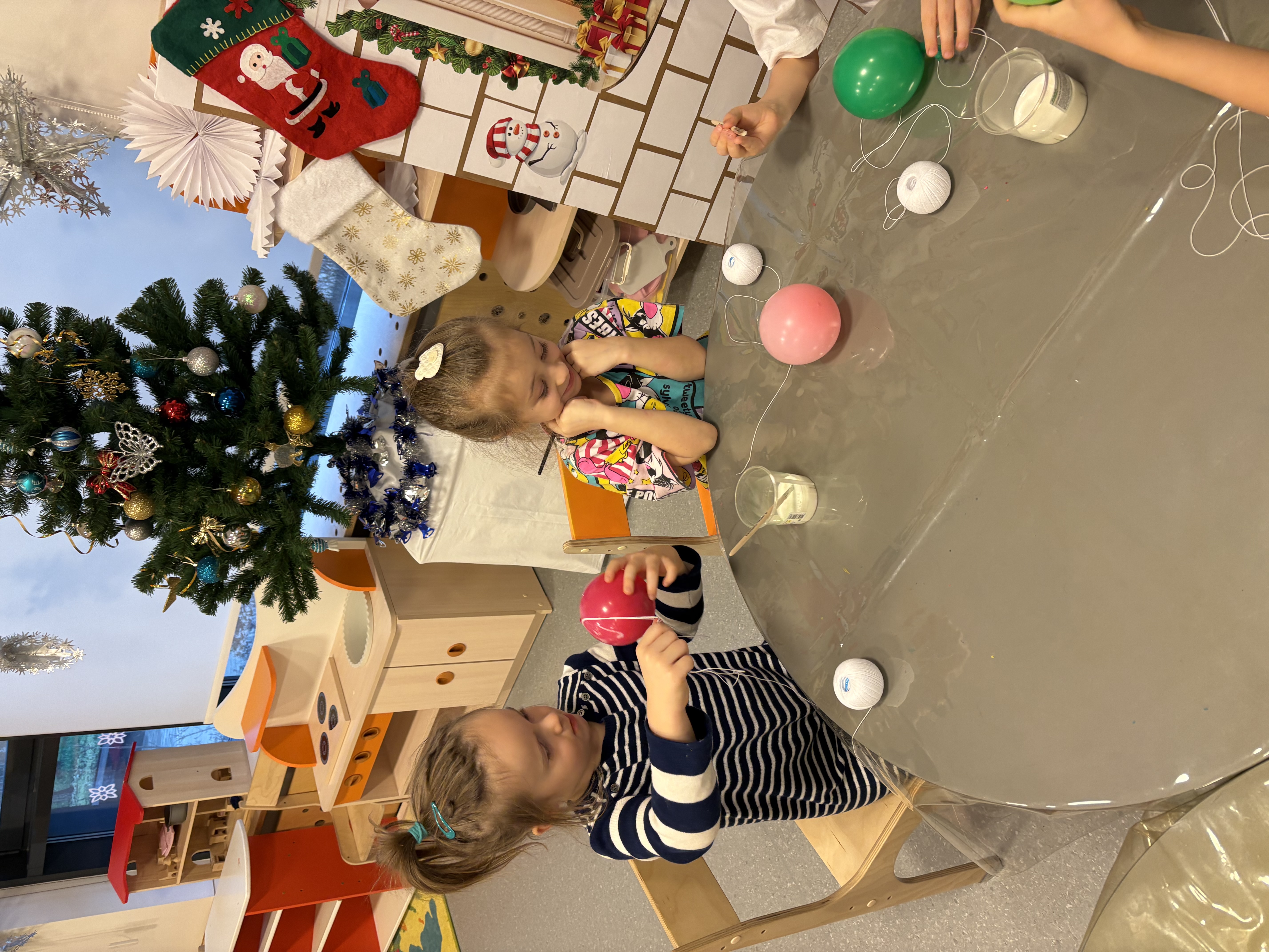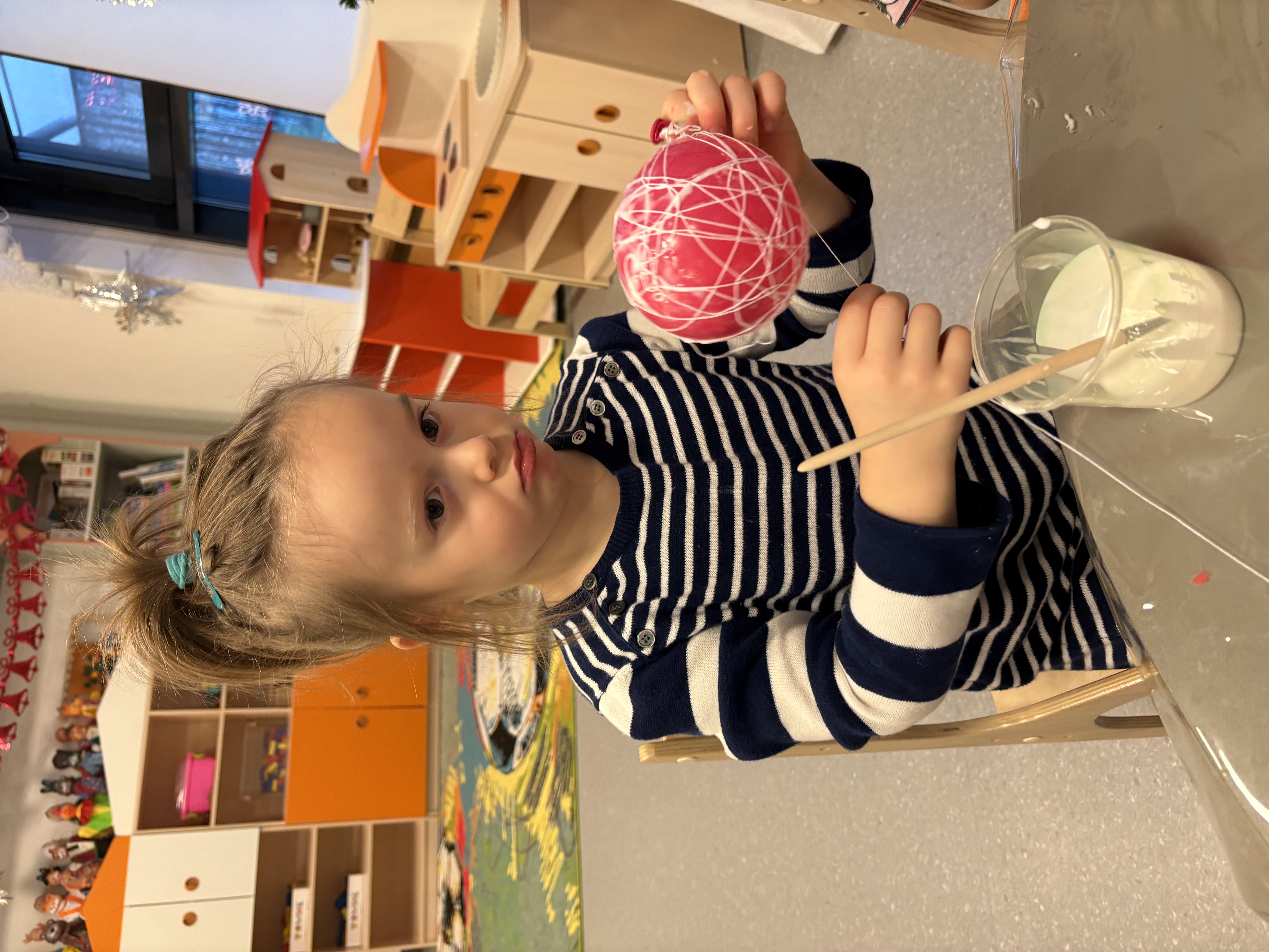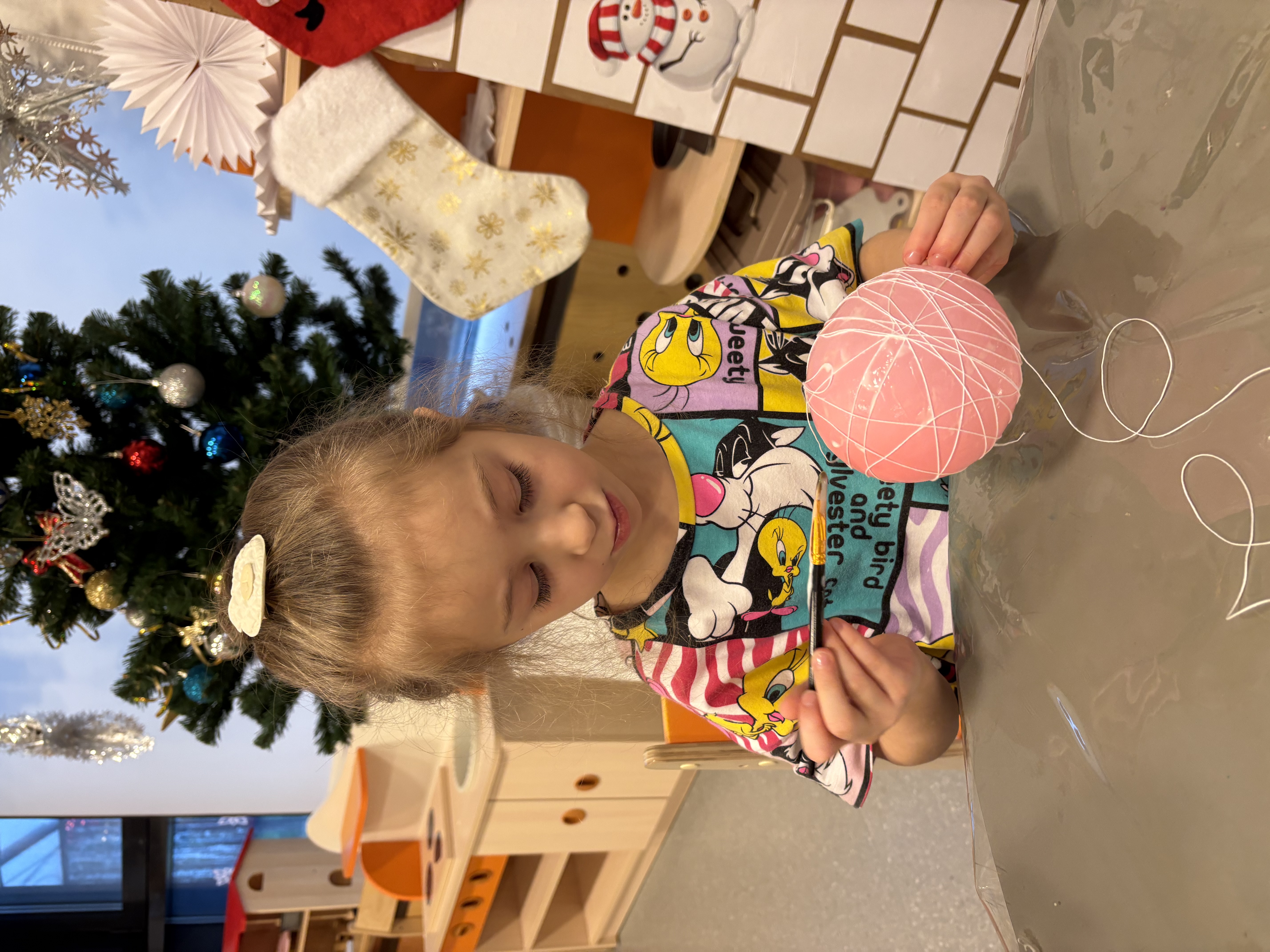 В преддверии Нового года в садике прошел творческий мастер-класс по созданию ёлочного шарика из ниток и клея. Для этого нам понадобилось: шарик воздушный, нитки и клей ПВА.