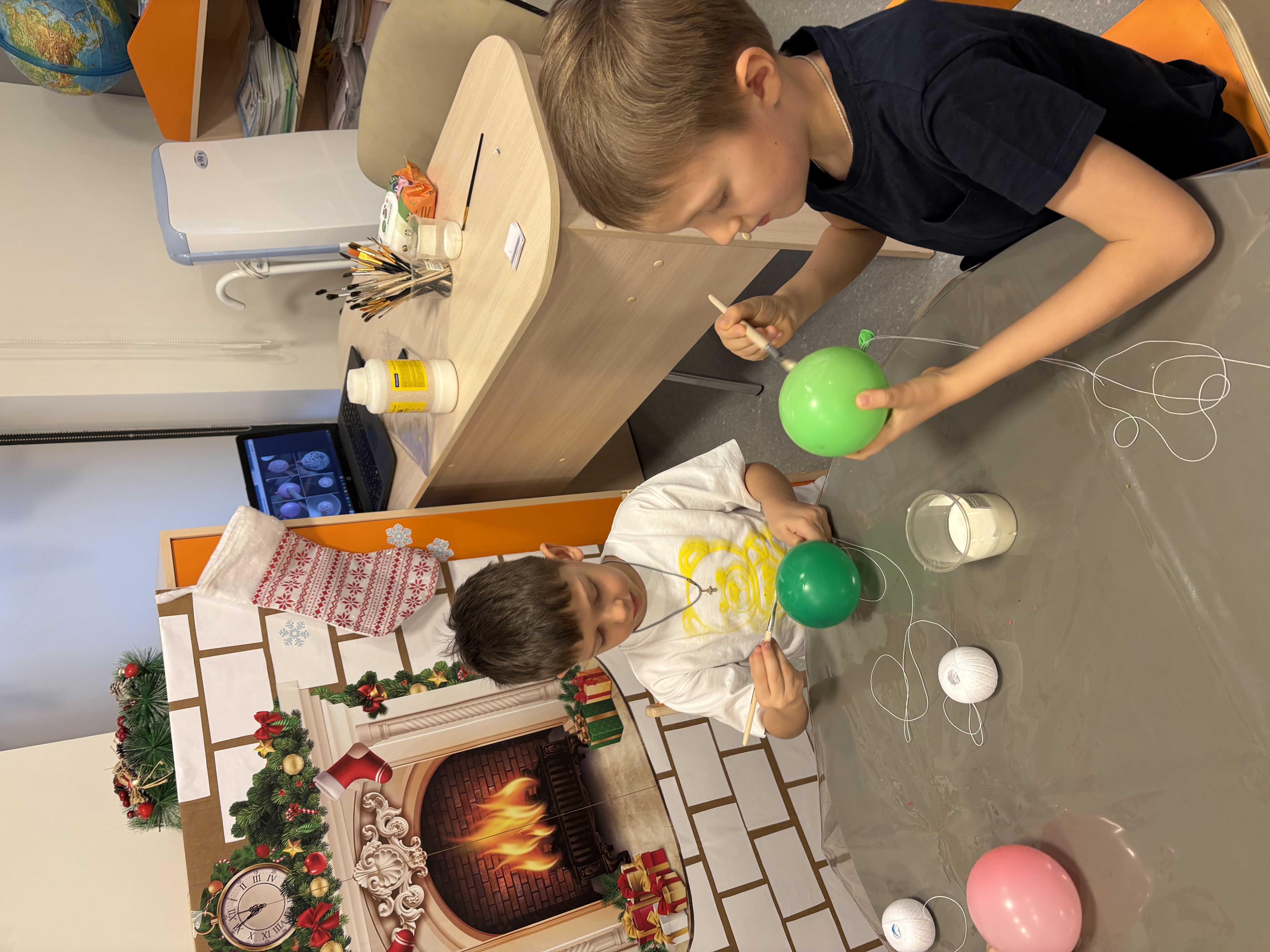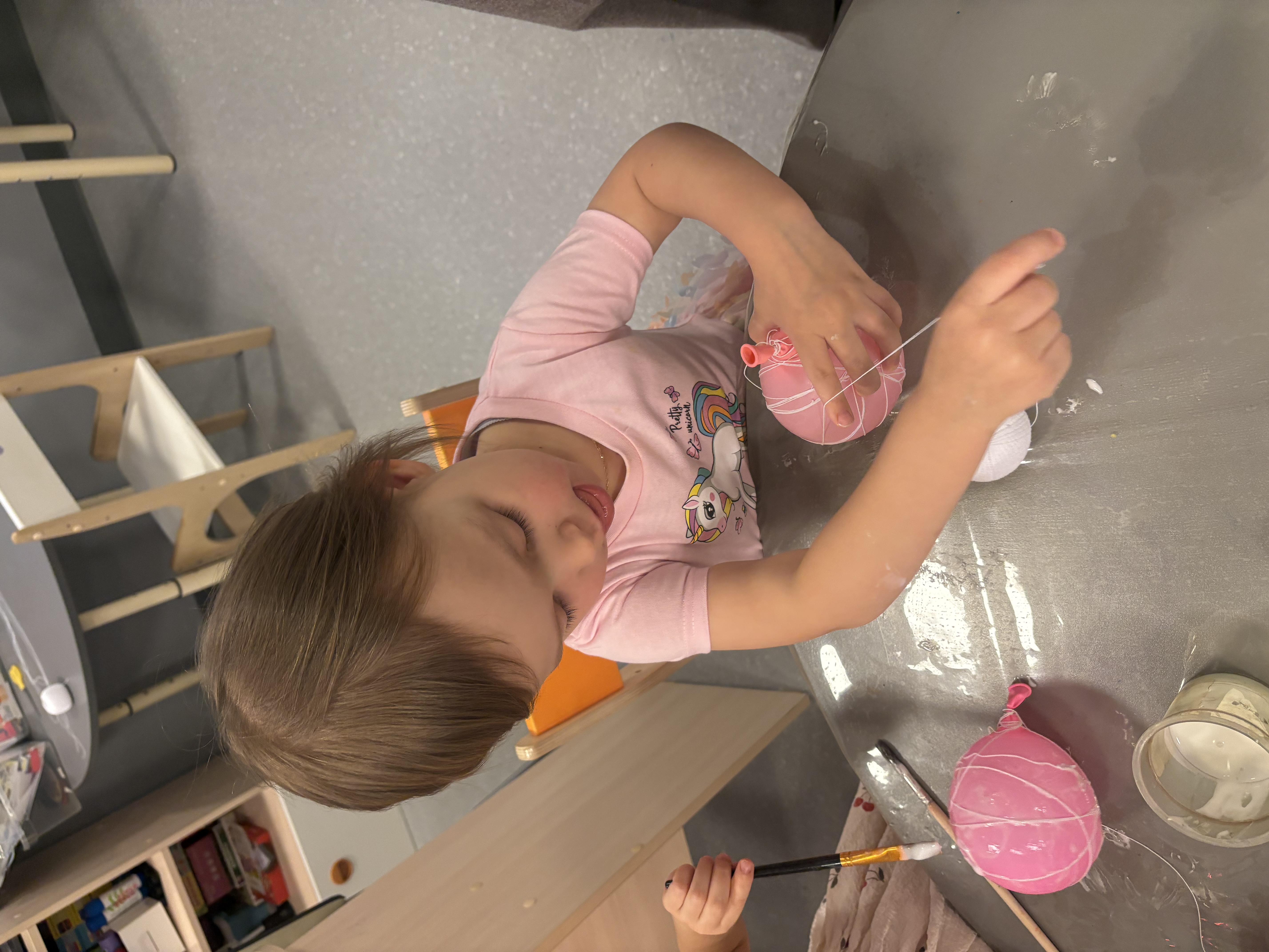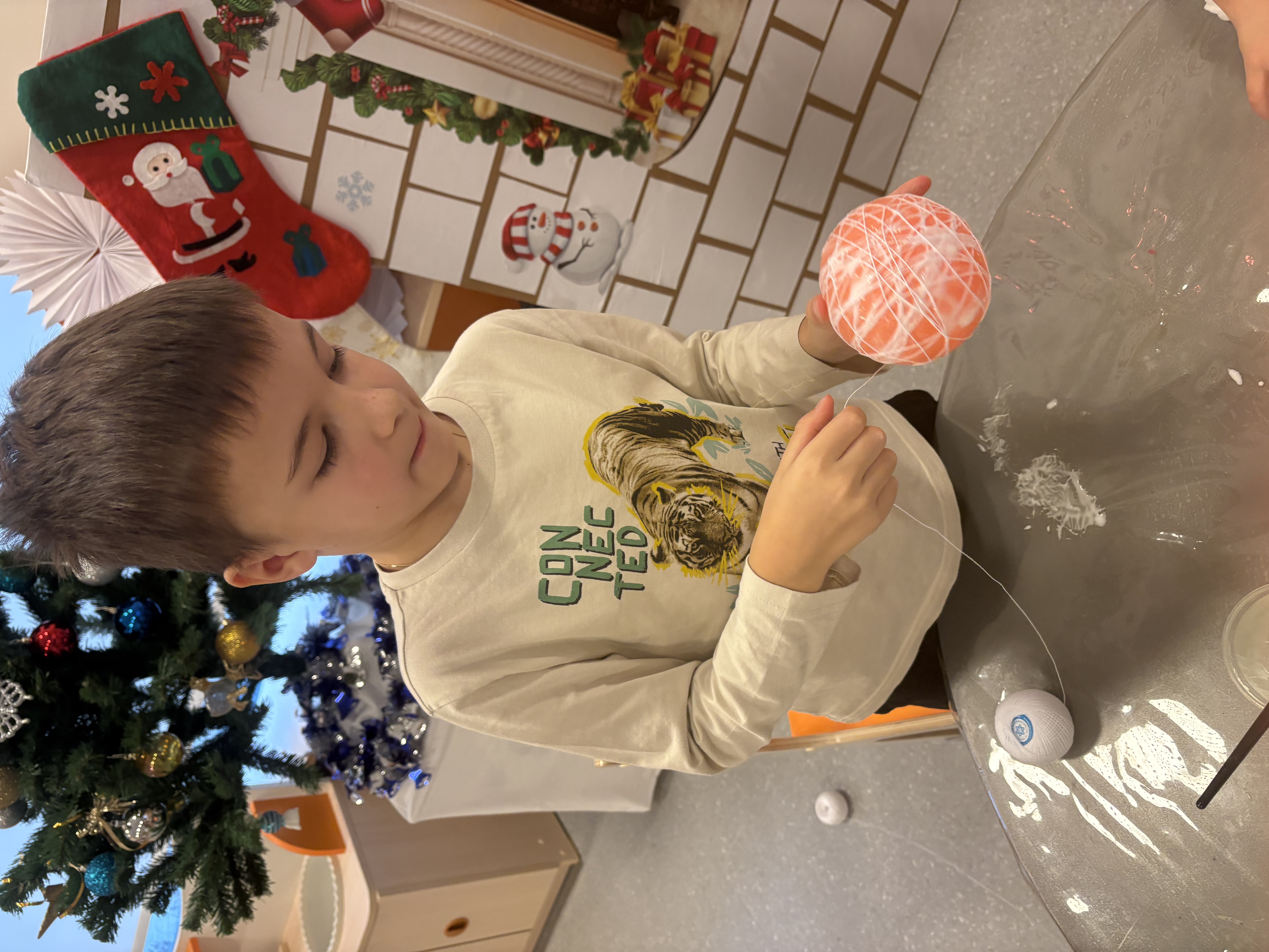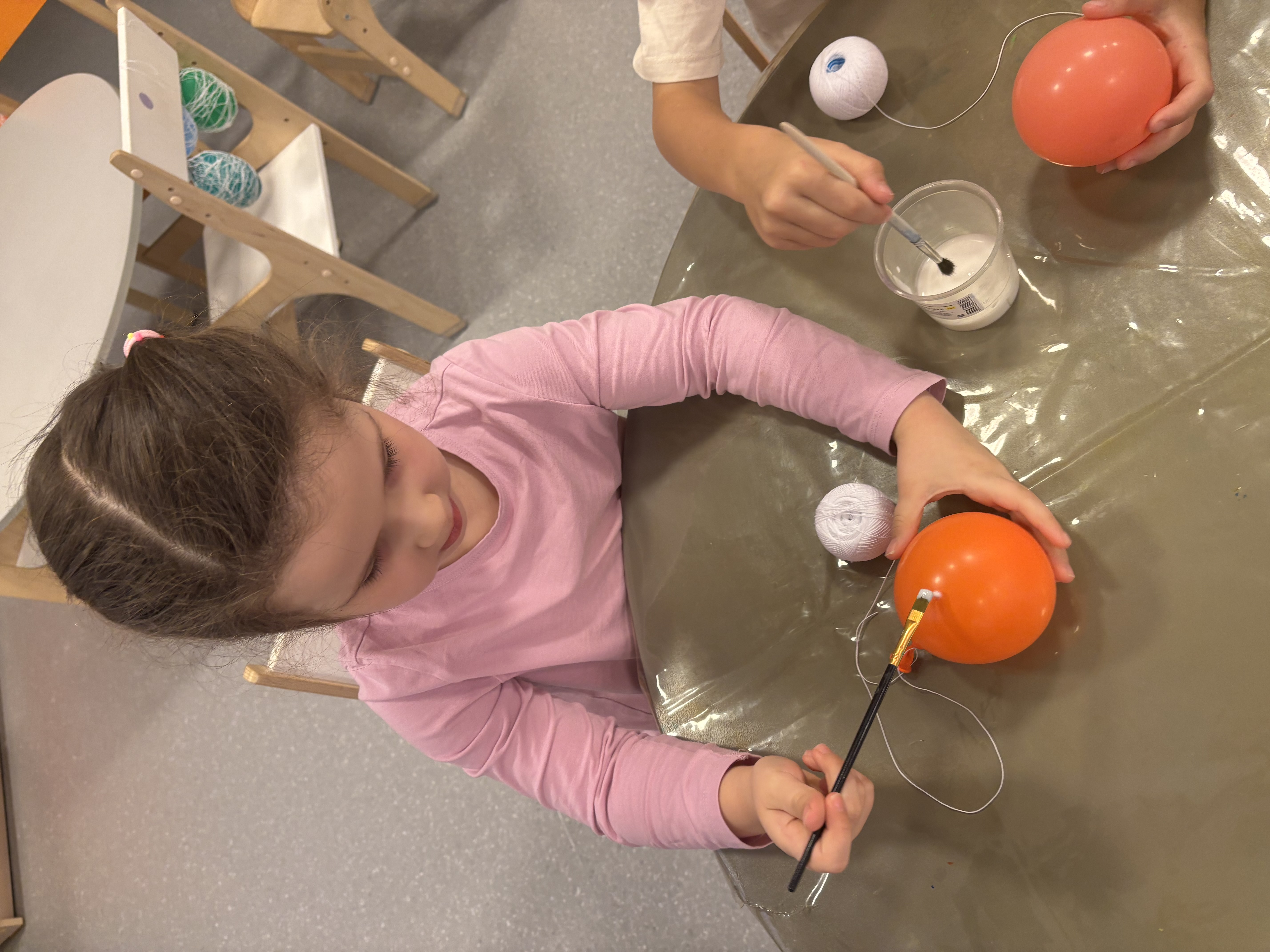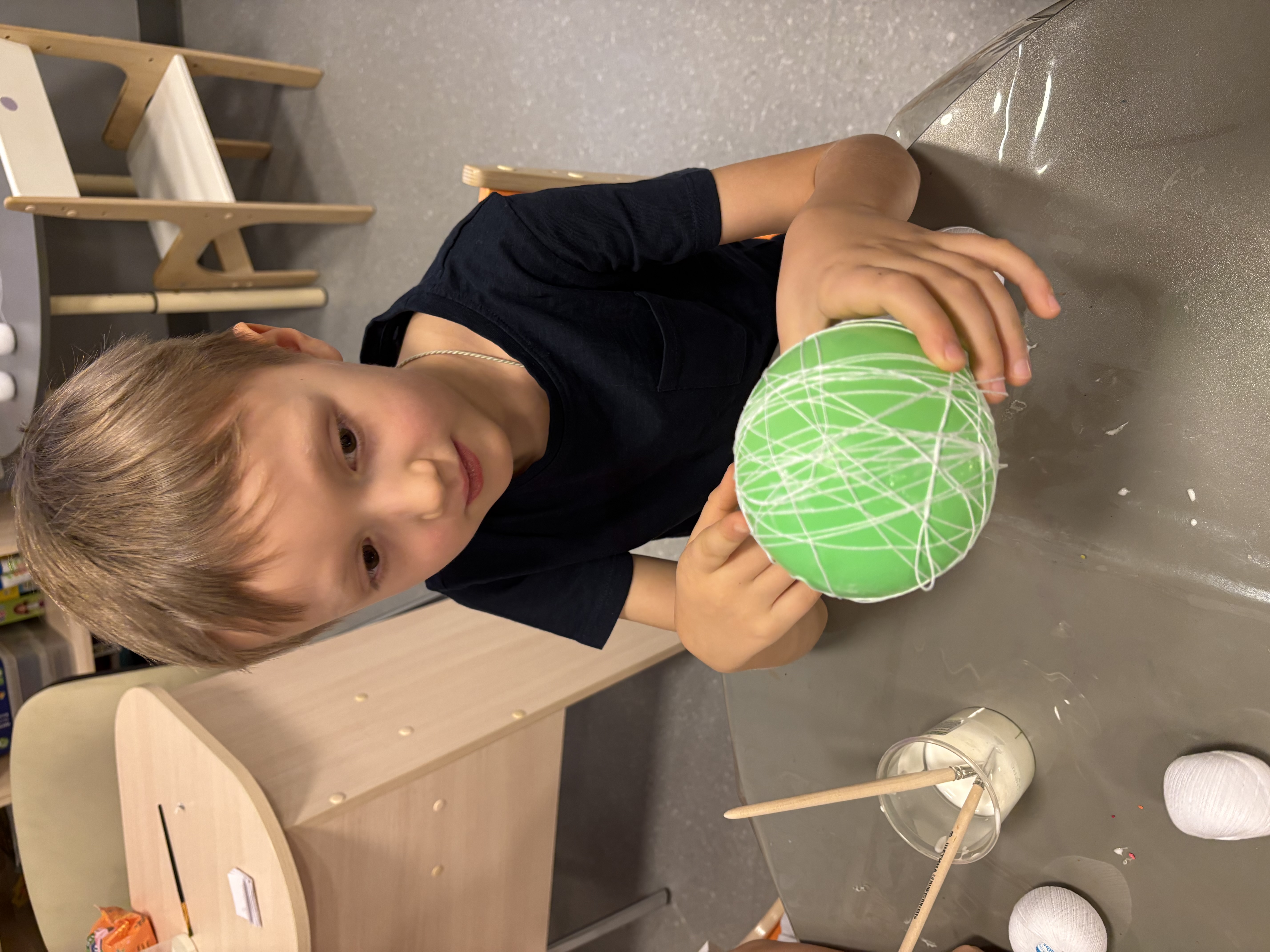 Мы надули воздушные шарики, нанесли клей на шарик и аккуратно обмотали его нитками, создавая ажурные узоры. Процесс творческий и медитативный.