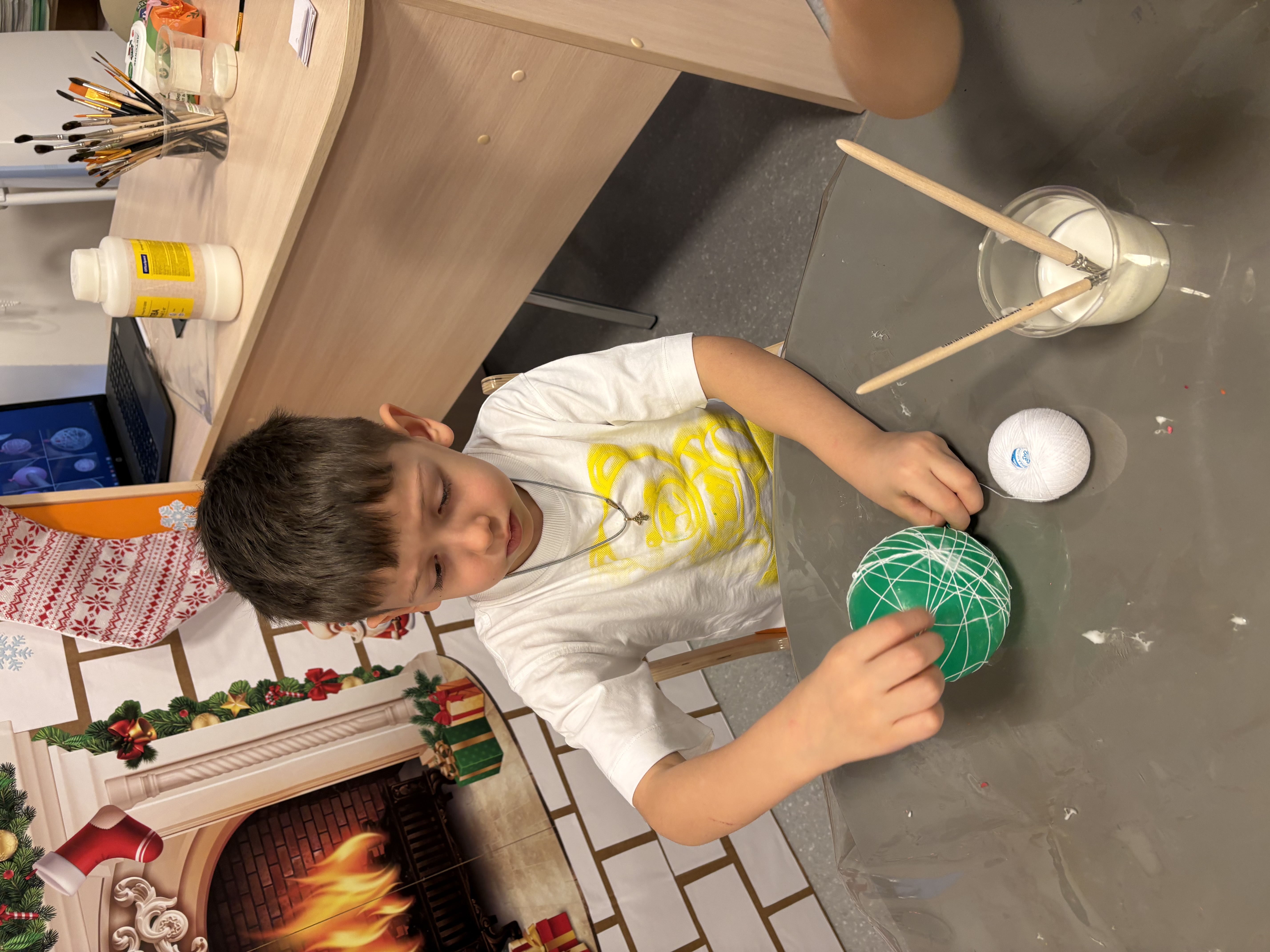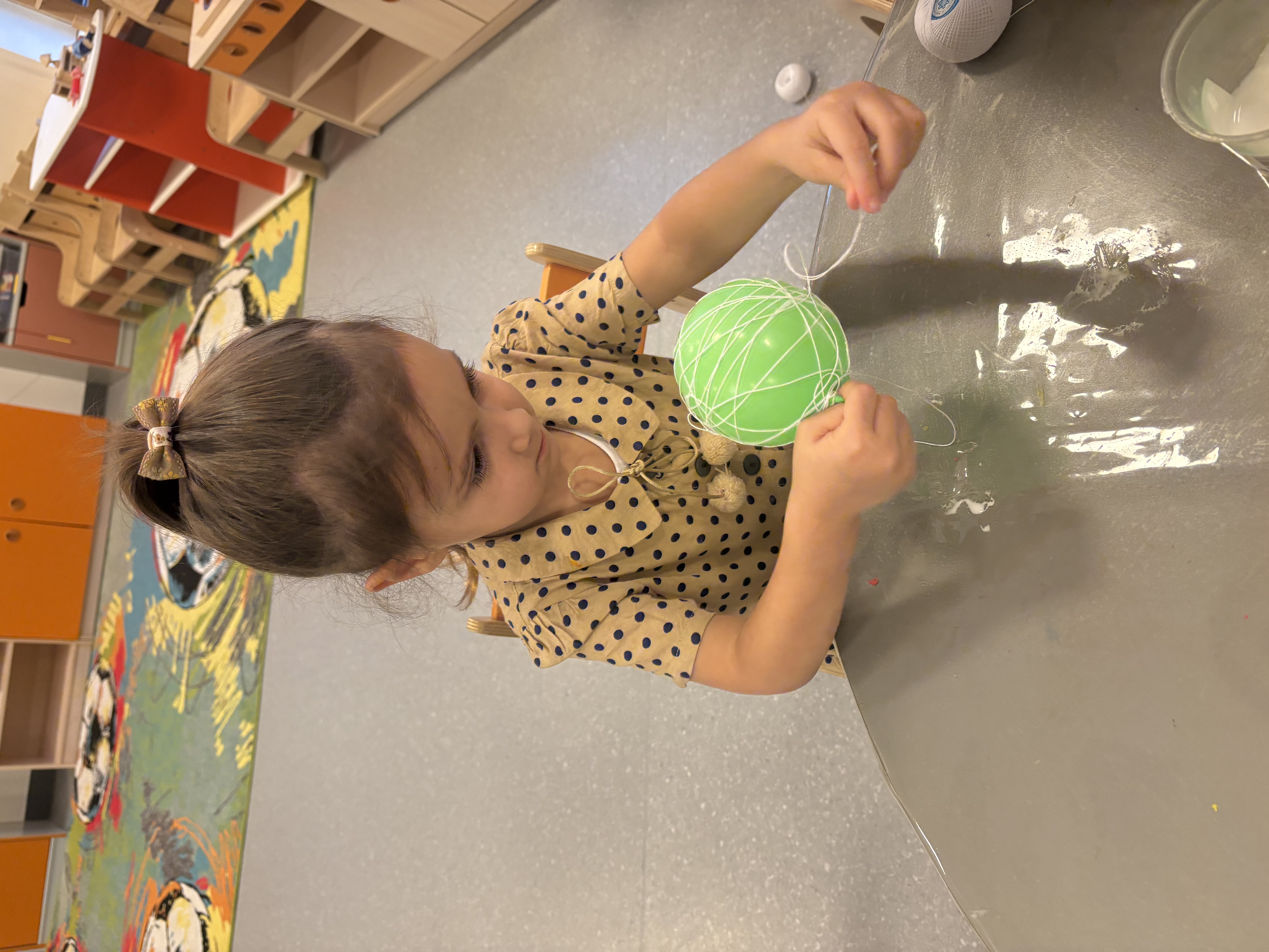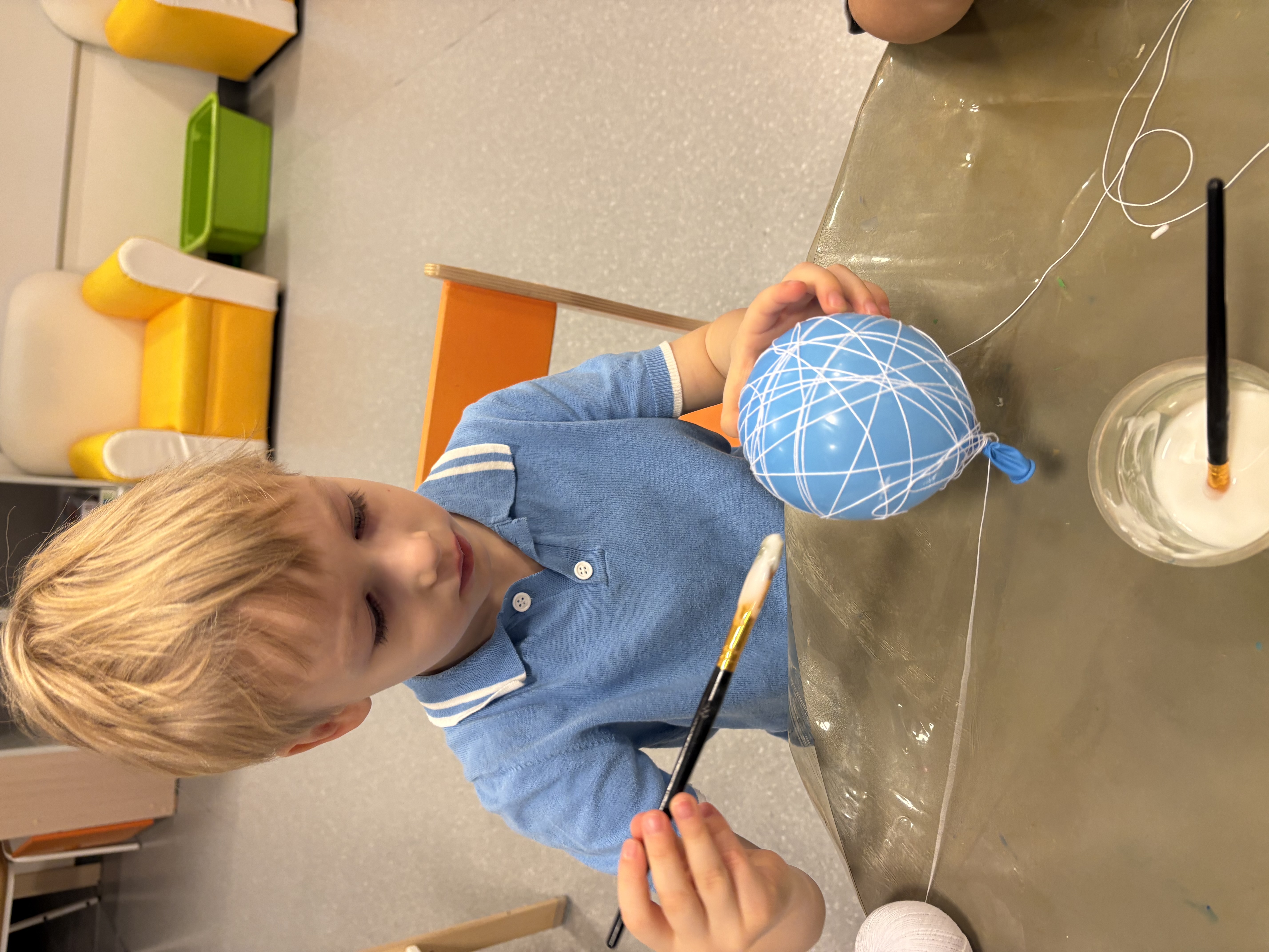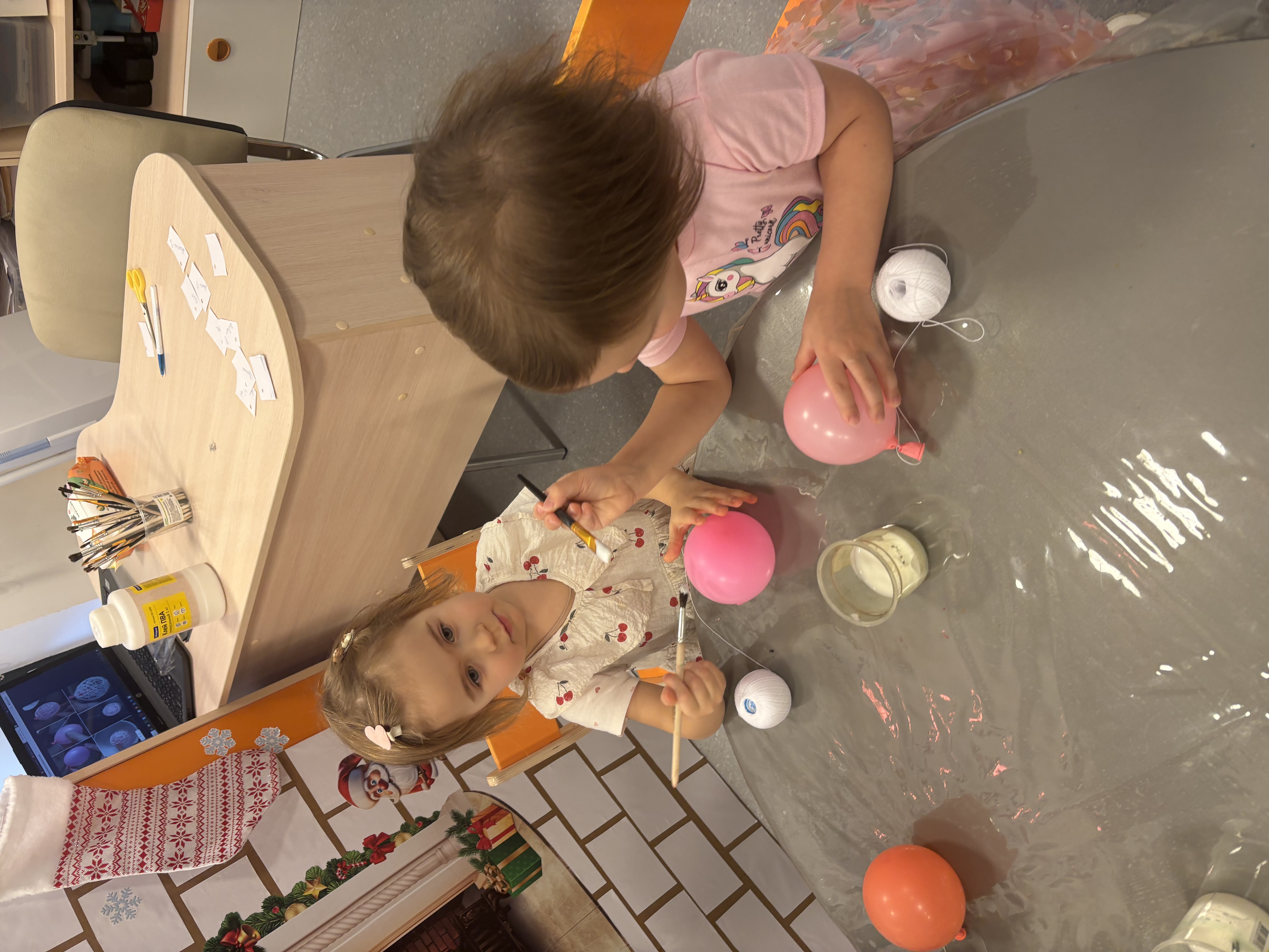 Мы надули воздушные шарики, нанесли клей на шарик и аккуратно обмотали его нитками, создавая ажурные узоры. Процесс творческий и медитативный.